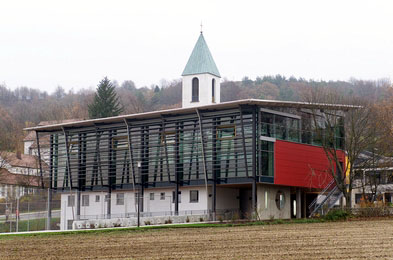 Angesichts der exponierten Lage des Hanggrundstücks am Fuß der Neumarkter Albtraufe war es Ziel als Abschluss des bestehenden Westflügels der vorhandenen Schule ein prägnantes und dennoch leicht wirkendes Gebäude zu gestalten.